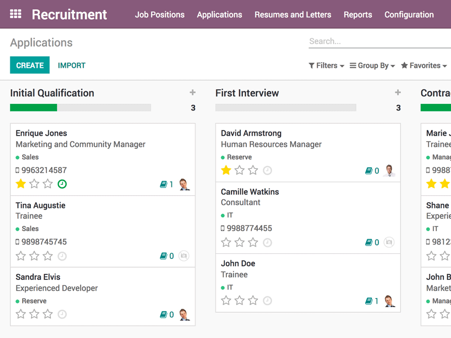 Optimisez votre processus de recrutement et de sélection avec Odoo. Créez une page Carrière attrayante, faites la promotion des postes vacants et gérez les candidatures sans effort. Suivez de près chaque poste vacant et chaque candidat et créez une base de données de compétences et de profils, y compris des documents indexés.