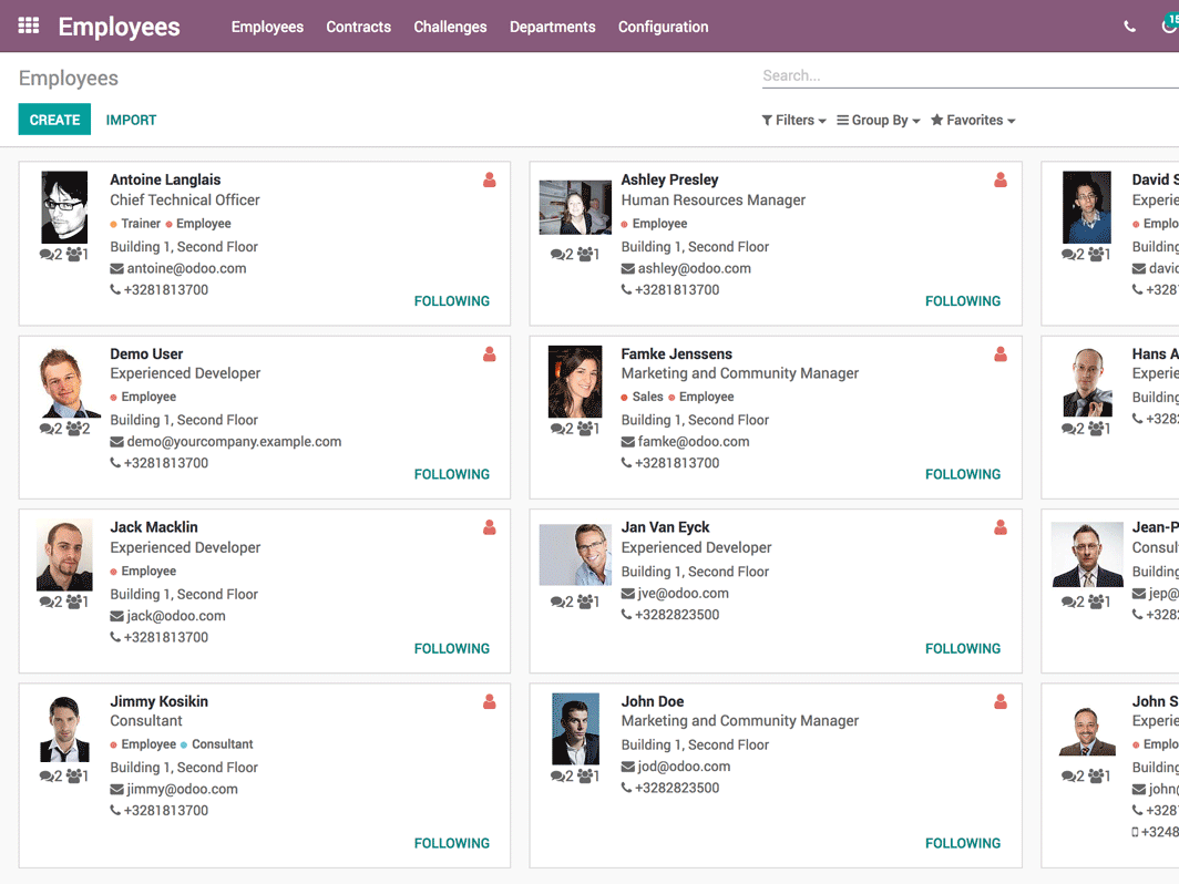 Le module de gestion du personnel d’Odoo offre une gamme complète de fonctionnalités permettant de soutenir tous les aspects de la gestion du personnel. Depuis l’embauche et l’intégration de nouveaux employés jusqu’au suivi de leurs performances et de leur développement, Odoo fournit une plate-forme centrale où vous pouvez gérer tous les processus liés aux ressources humaines.