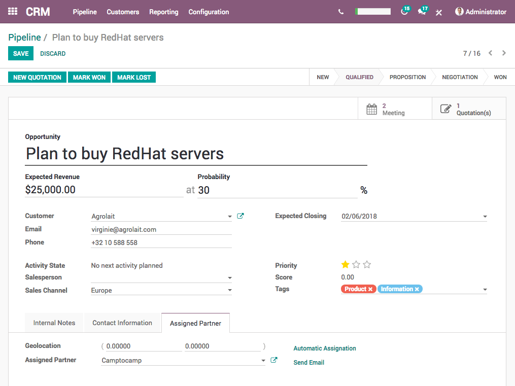 Toutes les informations relatives à vos clients disponibles sur une plateforme centralisée est essentiel pour le succès de l’ensemble de l’organisation. Avec Odoo, Dynapps veille à ce que chaque membre de votre entreprise dispose d’un dossier client à jour. Suivez les prospects, finalisez les opportunités de vente et obtenez des prévisions précises.